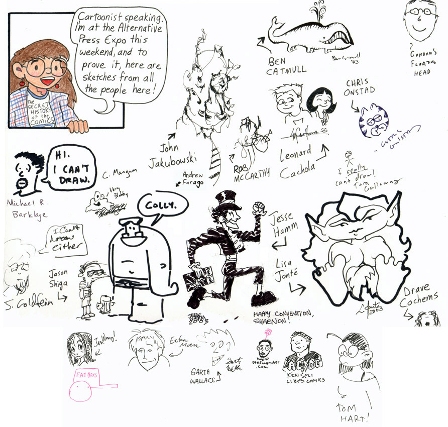 Man, this is a star-studded spectacular of a sketch page. Chris Onstad drew me a Garfield! Tom Hart drew Mell! I really like Jesse Hamm’s HappyGoth there in the center and Ben Catmull’s six-footed whale. Don’t know what’s up with all the people saying they can’t draw, though.