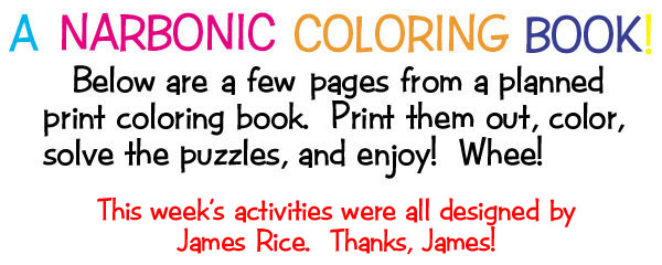 Again, I owe a huge debt to James Rice for designing the coloring-book puzzles in this installment, as well as many of the puzzles in previous installments, and printing the final book. He really got into it. So thanks, James!
