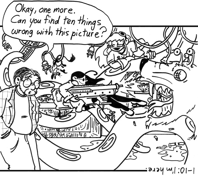 When we published the coloring books, we discussed whether or not to include an “answers” page. I suggested that we should, but that all the answers should be wrong. Shaenon immediately agreed, then left it to me to create all the wrong answers. That meant that all the puzzles were created twice, including the maze. It was one of those jokes that Shaenon like so much, the kind with huge amounts of work with very little pay off. I don’t know if anyone ever noticed.