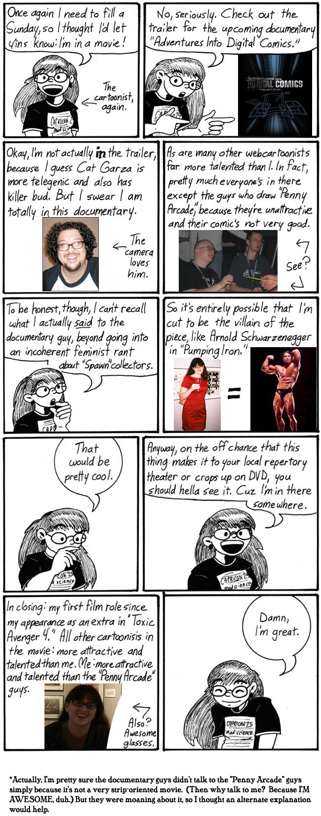 This strip is embarrassing. I was pissed at the Penny Arcade guys for doing a strip making fun of specific people in the Digital Comics documentary, including friends of mine. They have to pull a dick move every once in a while, I guess. Apparently they were made about not being in the documentary, having forgotten that the filmmaker had asked them and they turned him down.
