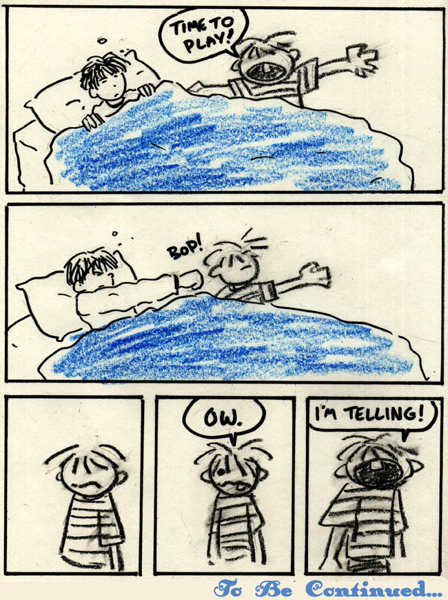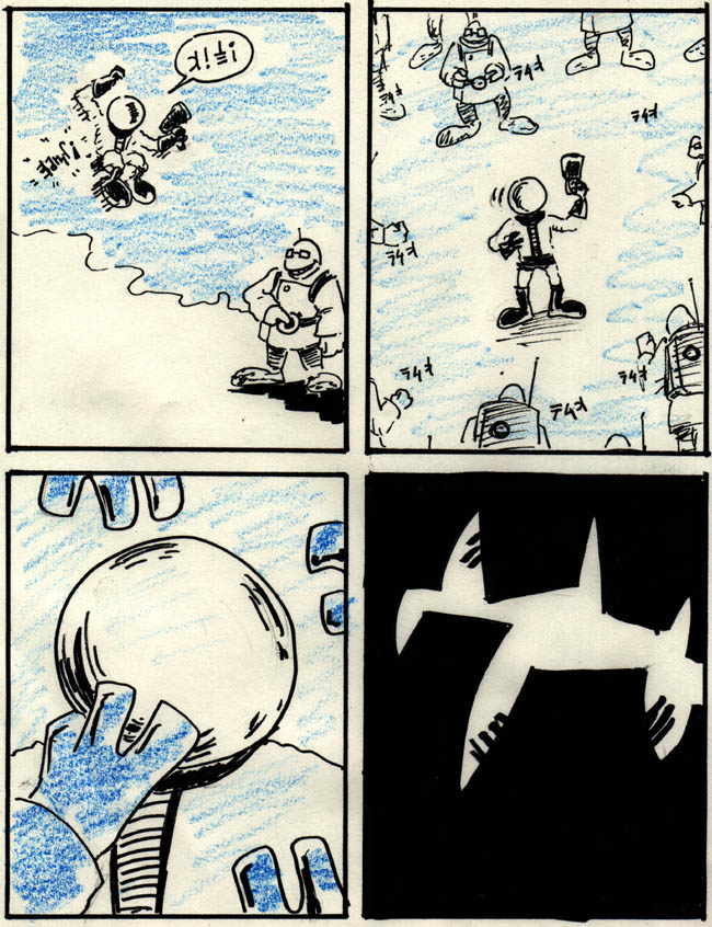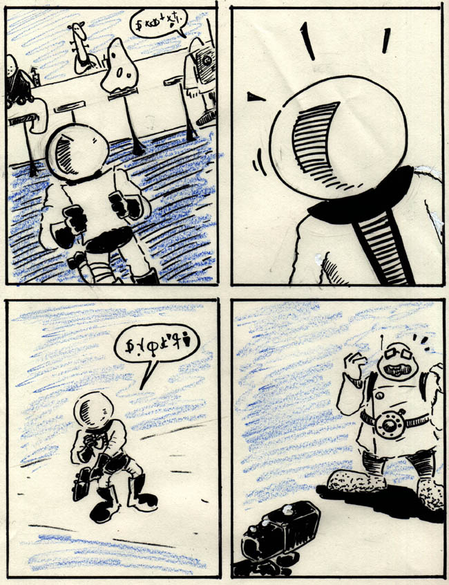 Andrew’s comic involves a few ideas he was working on at the time but never ended up developing into a finished comic. He wanted to do a sci-fi adventure comic, and he wanted to do a comic based on himself and his younger brother Chris as kids, and somehow the two ideas combined into this.