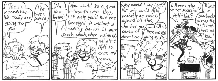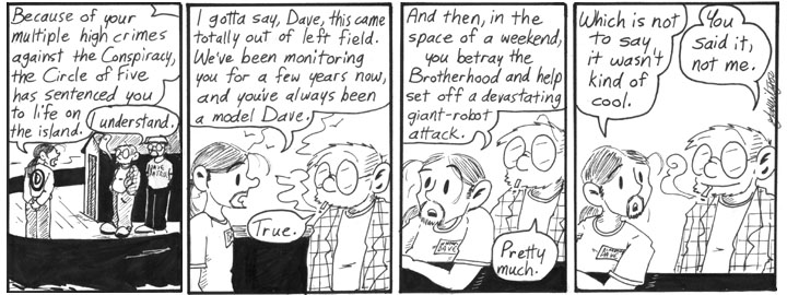 At last, a mystery is solved. Bear witness in panel 1 to the Dave Conspiracy’s Ominous Omnipresent Logo.