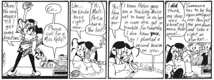 I love this strip. Mell’s immediate resort to threat of lethal force to accomplish something that just asking politely would do at least as well. The dramatic standing on the counter to hold the place up (for directions!). Artie calling her on their phone. The quick shift to casual talking-on-the-phone pose, with the grenade still at Mell’s elbow. Mell checking out her vibrating shoe. (And why does the tracking beacon vibrate, anyway? I’m assuming just because it’s funny.) The unexplained idea that Mell’s shoe has a usual degree of vibration. Artie just assuming that Mell’s using a gun. Imagining what this conversation sounds like to the people who can’t hear Artie’s end of it. (Not really any weirder than it actually is, come to think of it, but still…) Brilliance, all of it.