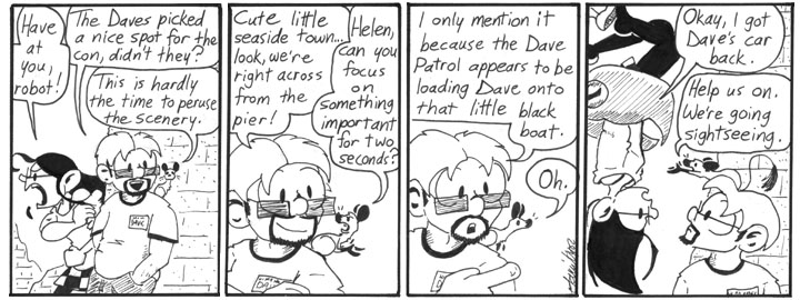 The guy running from the robot in the third panel is supposed to be Dave Lister from “Red Dwarf,” a show that was an enormous influence on Narbonic, by which I mean I stole all the good jokes. I thought of including other famous Daves in the D-Con storyline, but I didn’t get in all that many.