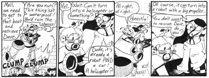 I would totally buy a wallpaper of Mell in that pose in panel 3. Or better still, just draw it myself. (Shaenon is now screaming, “What the @#$%&* do you mean, BETTER? I’m workin’ here!!”)