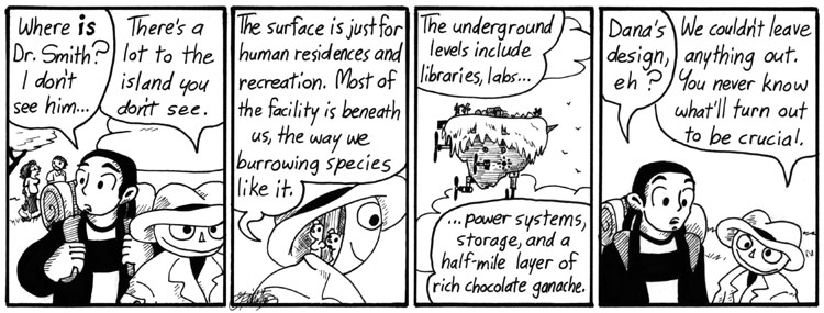 In the background of the first panel, you can see the tiny figures of genius cartoonists Jason Shiga and Derek Kirk Kim.