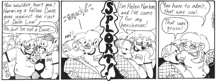 Dave’s conflicted loyalty between Narbonics Labs and the Dave Conspiracy throughout this storyline interests me, not in the least because neither choice seems especially wise.