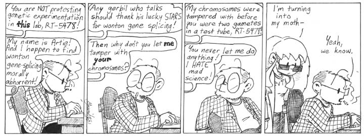 I’m still pretty fond of this strip. I like that Helen calls Artie by his full name when she’s mad at him. And the sheer petulance of, “I HATE mad science!” Surely Artie doesn’t mean that. I mean, who hates mad science? The other good thing about this strip, of course, is that it required me to draw very little. I didn’t even include Dave’s computer.