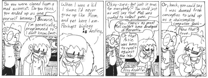 Dave doesn’t know it, but he’s hit upon one of Helen’s central preoccupations. Helen spends a lot of time wondering whether her madness was inevitable, as well as worrying over the related question of whether she’s actually going to grow up to be just like her mother. As those who have read through the archives know, her research into the nature of mad genius will drive the latter half of Narbonic. Also, this is not the last time Dave will try to cheer her up about being a mad scientist. So from that point of view, this is a pretty important strip.