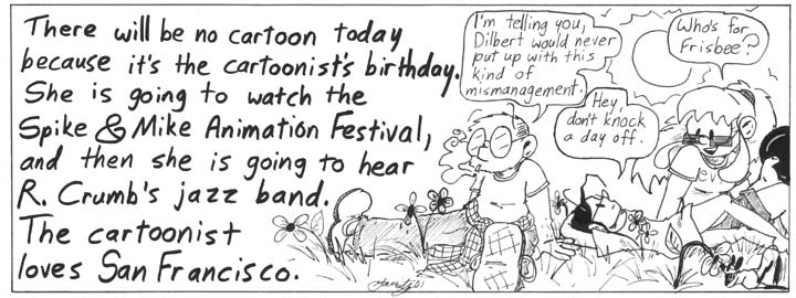 Helen’s T-shirt bears the image of a character from the incredible Don Hertzfeldt cartoon “Rejected.” In the previous day’s filler strip, I mentioned that I was going to the Spike & Mike animation festival; “Rejected” was part of the previous year’s Spike & Mike, which I saw with Andrew before we started dating. We laughed so hard at “Rejected” that we came close to throwing up. Sadly, nothing else in the Spike & Mike festival came close, and eventually we kind of stopped going. But that first time…that was golden.