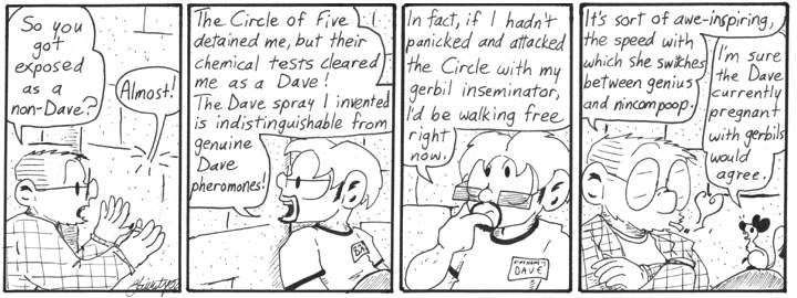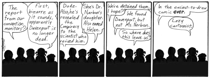 The Daves are right. This strip is a total copout. But an inspired copout. I’m sorry I lost a balloon tail there in the second panel, though.