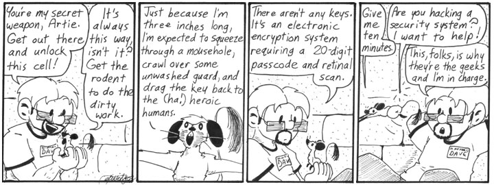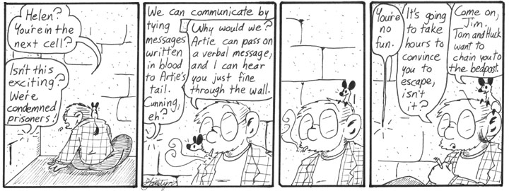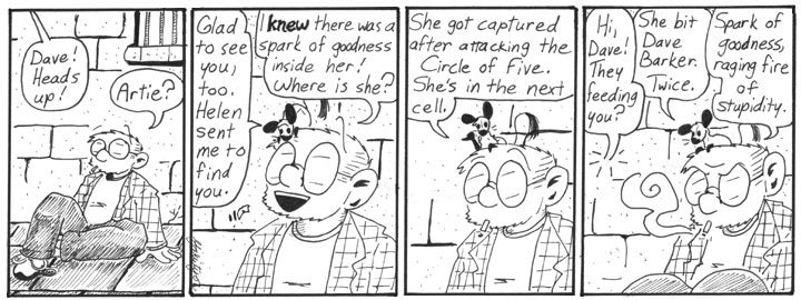 I love this whole series of strips. For one thing, they’re in a friggin’ dungeon. Which is somehow in the basement of a hotel. And Helen and Dave have to communicate all Count of Monte Cristo style. In other words, it’s completely nonsensical and has almost no connection to anything else in this storyline, and is therefore awesome.