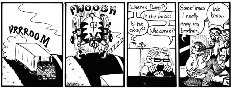 I don’t laugh at many of my own strips, but this is one of them. It turned out just the way I imagined it. I’m still surprised I managed to get the last panel looking as good as it does. That’s kind of a hard scene to draw, a bunch of androids tossing a guy out the back of a semi while he shouts into a cell phone.