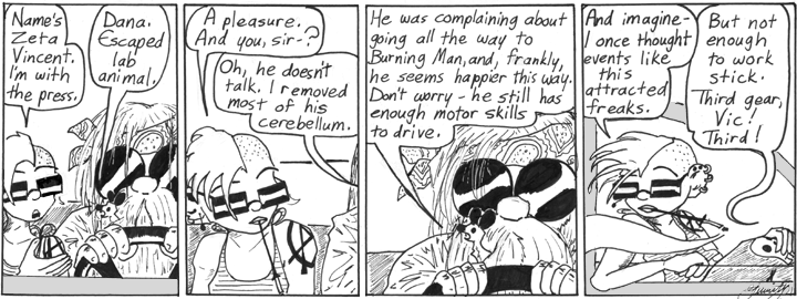 The whole running Zeta and Dana subplot was never meant to occur. It just cropped up because I got softhearted and decided to spare Dana from the carnage at the end of “Smart Gerbils,” which meant that I had to get back to her at some point if I didn’t want an annoyingly dangling plot thread. Then I needed to come up with another character for Dana to talk to, because it’s nigh-impossible to write strips around one character monologuing. Somehow I came up with Zeta. I like drawing punk girls.
