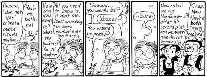Okay, so I just like writing Dave drunk. He gets kind of belligerent. This strip is just silly, but I regret nothing but those horrible grey fills.