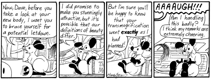 Dave’s comment brings to mind a trope about characters keeping their faces when they transform. Though I suppose the intended joke is in Dave’s loyalty to his body extending only as far as the bridge of his glasses.