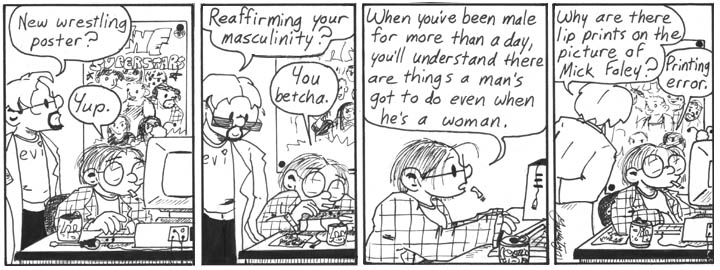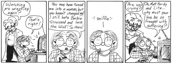 Yeah, this strip is just fluff, but at least I got off the subject of pro wrestling. Also, “Funny Girl” comes up again, if only as a video cover. I swear people still occasionally watched videos at the time I drew this strip.