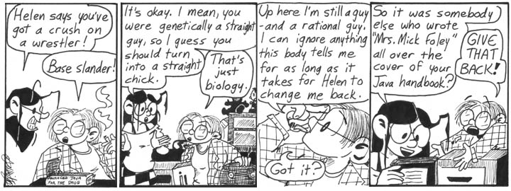 Sorry, what were we talking about? Oh, yeah. The gender swap. Girl Dave actually looks pretty cute in this strip. If I were drawing this later, though, I would’ve made her hair less stringy, and more like the way I drew guy Dave’s hair in the later years.