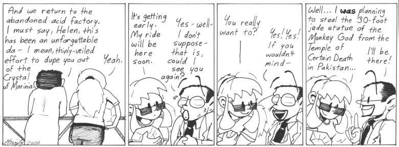 Finally: Helen’s expression in panel 4 is spot-on Damsel in Distress. Then again, perhaps genuine Damsels have larger mouths.