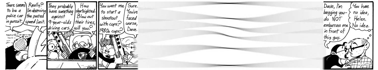 If this storyline’s three time foliations can be divided into film genres, then we can appreciate the dizziness Dave must be feeling at being suddenly dropped from a family action movie into a teen romantic comedy or an existential science-fiction drama. More saliently, it also provides some insight into the kind of rules each temporal world operates under. Kids shooting a police car, for instance, makes perfect sense in 6-year-old Dave’s world.