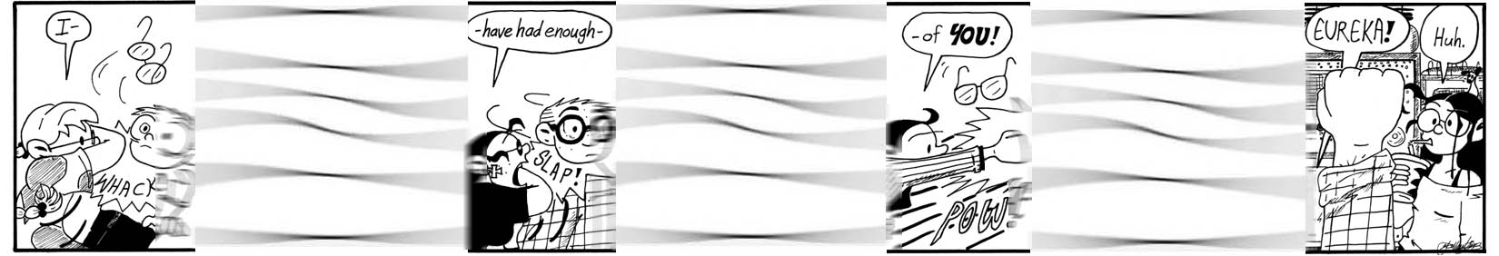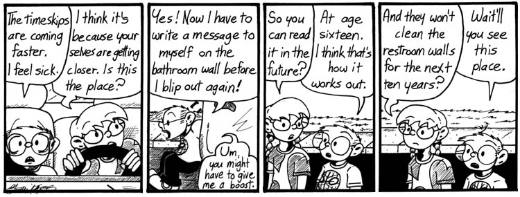Doing this week of strips with the multiple time jumps was fun, but it was hard to write gags for it. This midweek lull works moderately well.