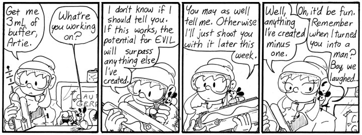 I’m glad Narbonic stayed modern in its depiction of Science. I love Steampunk, but I’ve got Girl Genius for that. Narbonic is where I get my fix of B-movie robots, modern bubbling test tubes, and gleaming steel Clone Tanks. My 14 year old daughter, a budding biologist of the MAD persuasion, prefers Narbonic to GG for that reason.