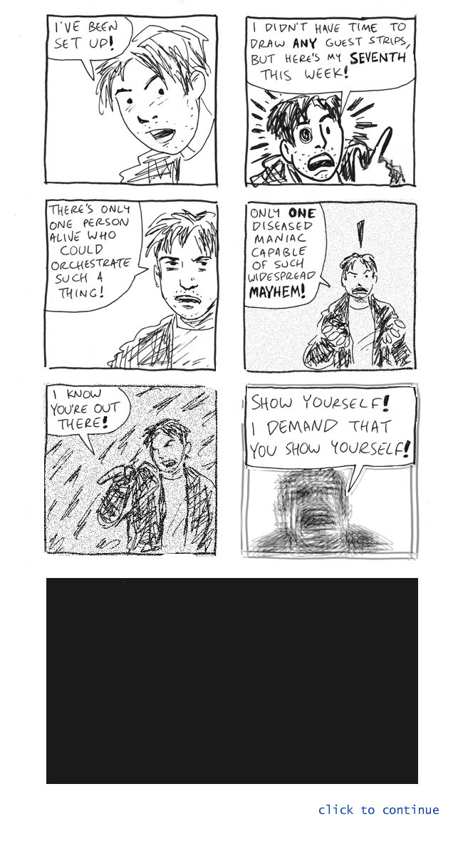 ANDREW FARAGO WRITES: This wraps up the week’s worth of Narbonic fill-in strips that I did. My lettering’s not too bad in that last panel, and I managed some pretty expressive faces, so that’s good. I’m a little bit better at drawing now, as seen in my current comic, The Chronicles of William Bazillion, which updates every Wednesday. Check your local listings for the time and channel.