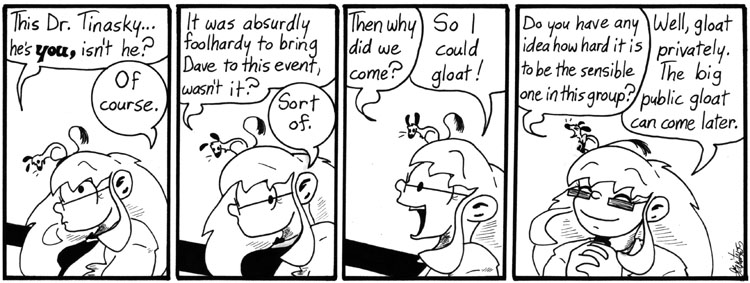 Helen really is playing with fire, taking Dave to this event. But she was curious to see how people were reacting to the Tinasky study. And, well, sometimes Helen makes really unwise decisions. Most of the time, in fact.