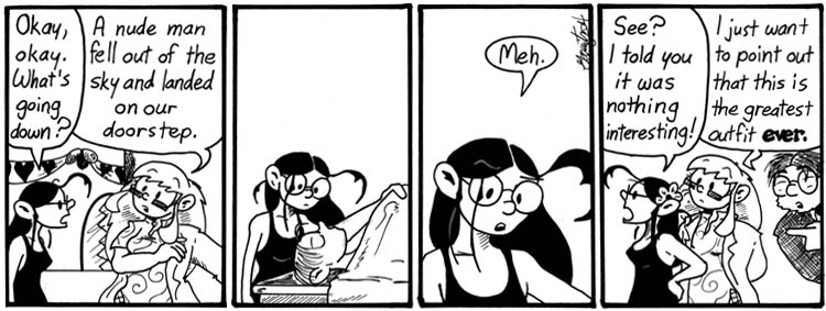 All the funny stuff is in the first two panels of this strip. Sometimes it works out that way.