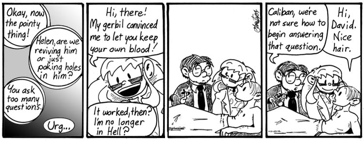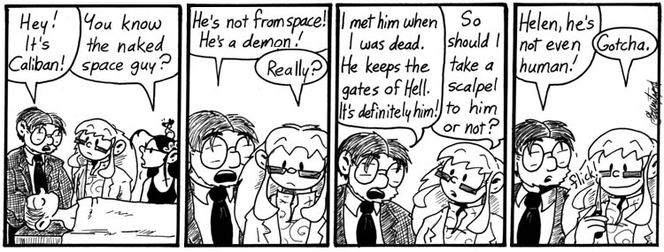 It’s weird having scientists and supernatural beings in the same comic. The Narbonic universe is structured one way for people like Helen and another way for people like Caliban. As they say in the Discworld books, it’s probably because of the quantum.