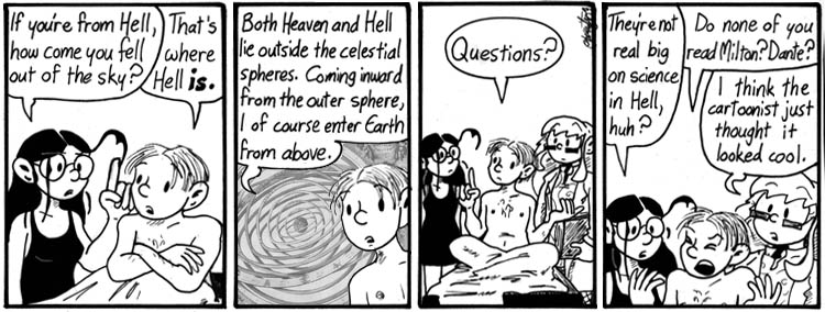 Caliban’s pose in the third panel is based on Jacques-Louis David’s Death of Socrates, although it also resembles Plato in Raphael’s School of Athens. This is now the classiest strip in Narbonic.