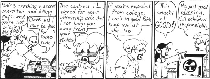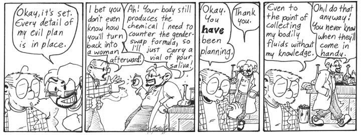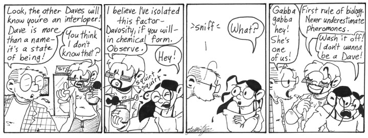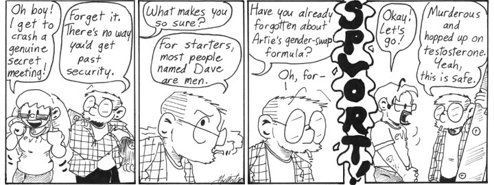 I ended up using the gender-swap formula several times over the course of Narbonic. In general, I tried to use inventions from earlier in the story wherever they would be useful. And I did kind of enjoy drawing the reverse-gender Helen and Dave.