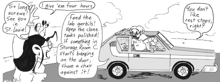 There are lots of little gerbil tails hanging out of the wastebasket in the last panel. This is not the correct way to dispose of your gerbils. Also, I notice I’ve once again drawn a Sea Monkeys Ocean Zoo among Helen’s lab equipment. I had one on my desk at work.