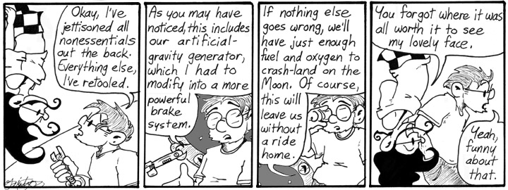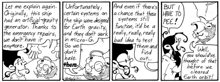 I was careful to use “micro-G” instead of “zero-G” because zero gravity technically doesn’t exist; even in deep space, objects continue to exert a small amount of gravitational force on each other. I was also careful to include a pee joke in this week of strips because peeing is funny.