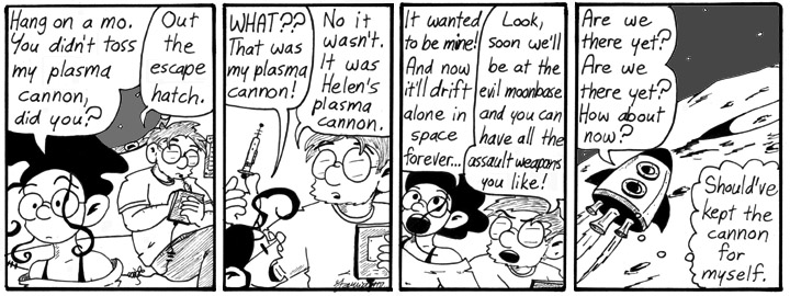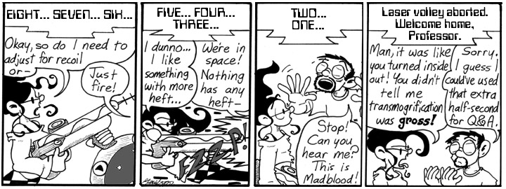 I have been on holiday and want to express appreciation for both this week’s strips so far, and zero-gravity in general. Also Mell’s angry face when she realises about the plasma cannon.