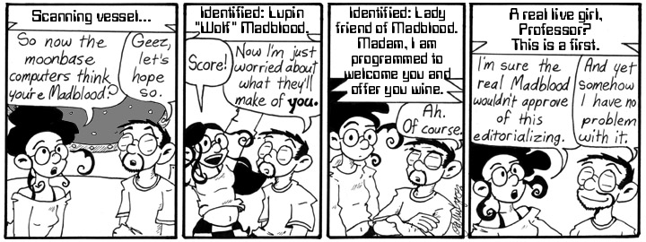 I do have to make one teeeeeny little criticism of Saturday’s comic. Panel 1: M’s arms down, hair up. Panel 2: arms thrown up, hair down. Panel 3: arms down, hair back up. Alas, it would be the exact opposite since throwing her arms up would drive her body downward, leaving her hair up. (And the first person who tells me there is no “up” or “down” in micro-G gets a rude noise made in their general direction.)