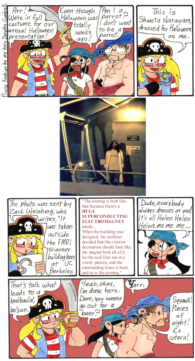 The costumes were indeed based on some pirate drawings Dorothy Gambrell did, but I can’t find them now. Sorry. Anyway, Halloween costumes! Always enjoy them. Sadly, Artie makes a very bad parrot and is not immediately visible, especially in the first panel, making it look like Dave is making pointed comments about his parrotness.