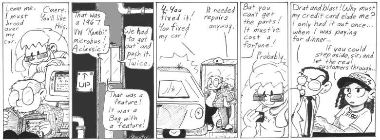 “Bug with a feature.” One of my all-time best lines, and I threw it away in the second panel. I. Am. So. Awesome.