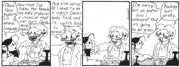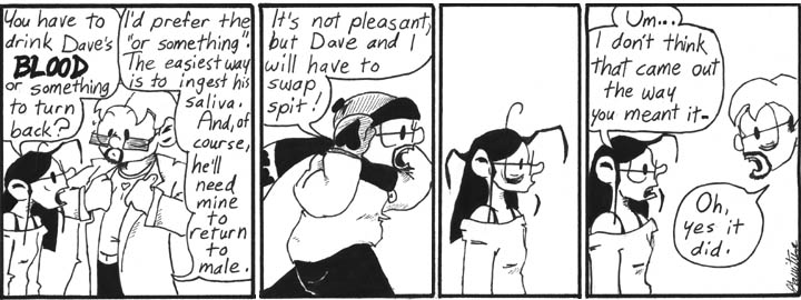First:, re Friday’s strip, cue the X-rated fanfics! (And I love having a dirty mind. Guess what popped into my head when Helen said “swap bodily fluids with Dave”? Heh heh heh… -_^)
