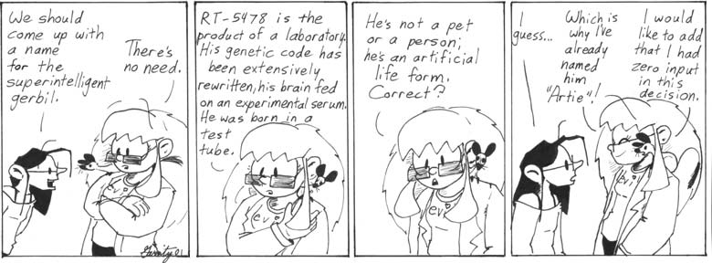 By the way, my very first piece of Narbonic fan art, “Gerbil Intelligence” was based on the drawing of Artie in the second panel of this strip.