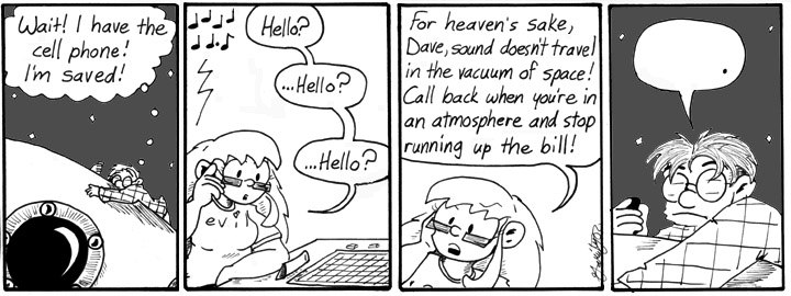 (The marvellous thing about this strip is that it seems like it’s playing a fairly standard “Sound in Space” subverted-trope punch-line, until you get to the end of the speech balloon and instantly realise that Helen’s entire reaction is completely ludicrous.)