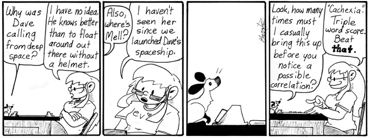 All the NASA acronyms Dave uses are real except for HDD, which, of course, stands for “Hostess Ding-Dong.” This is another of my favorite strips from this storyline, because I would totally do this. I wanted very badly to be an astronaut when I was a kid, in between wanting to be a writer and a psychiatrist.