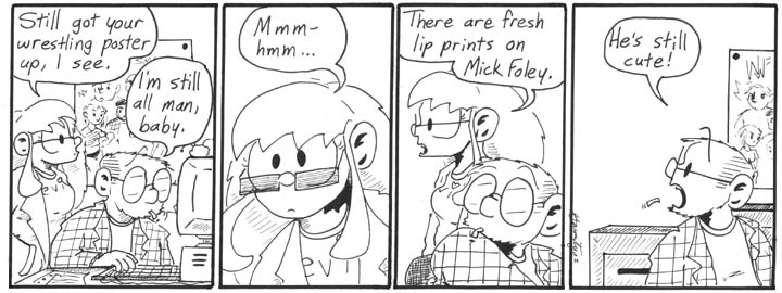 This really, really isn’t legible at all, but Dave’s pen cup in the second panel bears the name of the Kirby Grips, a band I was fond of.