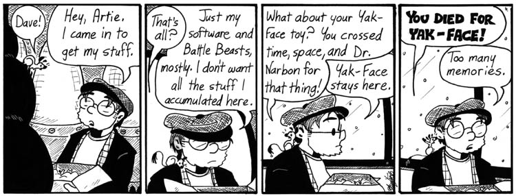 I like the apparently unintentional implication of depth of those speech balloons in panel 3 – Dave’s “See?” recedes into the corridor behind Artie’s balloon, which in turn is behind Dave’s “Exactly.”