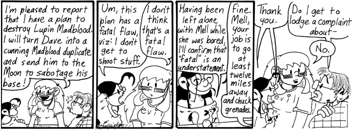 Mell has a bit of a one-track mind, don’t you think? But it occurs to me that she would actually be weirder if her shooting fixation was replacing with something more wholesome, such as playing magnetic scrabble or stealing teeth. There’d be whole swathes of Narbonic storylines where Mell struggles amidst robot hordes to find an official dictionary or quabble about upside-down Ws, or trick a Dave Patrol officer into opening his mouth within proximity of her omnipresent dental pliers. Really, the shooting thing makes some sense as a fixation and a meaningful contribution.