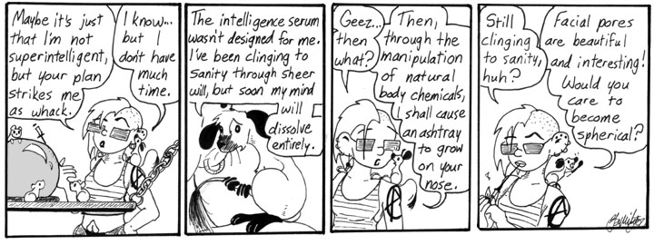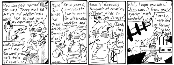 The drawing of Dana in the second panel is actually quite good. This is a pretty grim strip, really, what with the little gerbil descending inevitably into madness and death. The abandoned products of mad science often meet unfortunate fates in Narbonic. It’s hard out there for a monster.