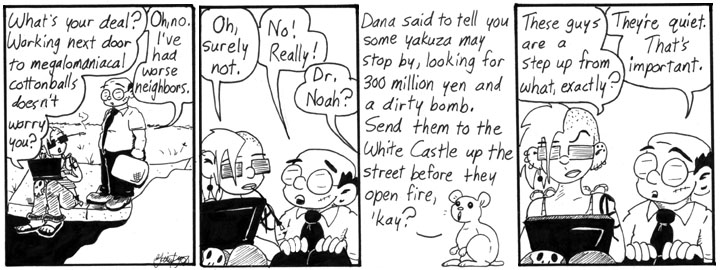 I think Dr. Noah appears in all of six strips over the course of Narbonic, and he’s probably a stronger character for it. I like to imagine him going about his daily business, working at the dental practice, playing canasta with the genocidal hamsters, somewhere off-panel while the rest of Narbonic is going on.