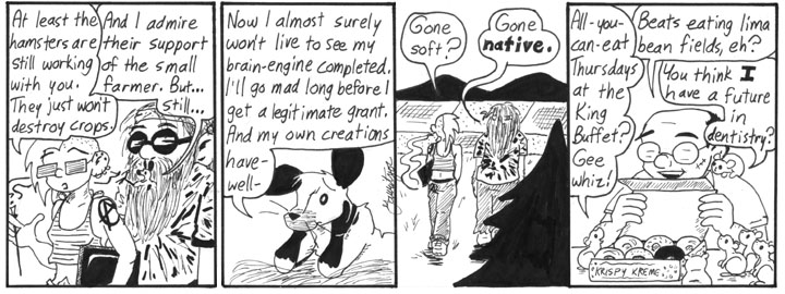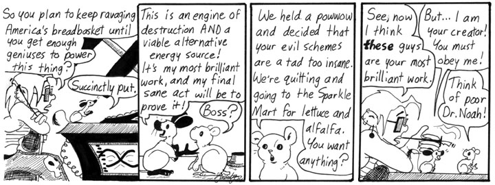 The really great thing about this strip is that, in the background of the first panel, a bunch of hamsters are dragging a crate with a radiation symbol stamped on the side, with some kind of hamster overseer or taskmaster riding on top. That is boss.