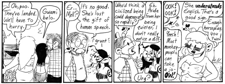 The only really good part of this strip is the phrase “atavistic jungle woman,” which I still think has a nice ring to it. Also Mell’s sulky expression in the second panel. Oh, and Mell gnawing on Dave’s arm. In fact, strike that. This strip is awesome.