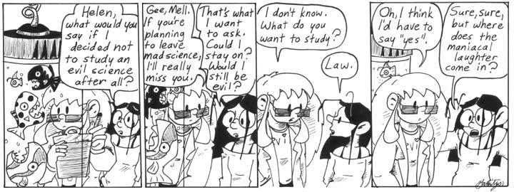 I can’t remember when I decided to make Mell a law student. It was pretty early on. The whole obvious “lawyers=evil” aside (which actual evil lawyers, I’m sure, resent), it was pretty useful as a non-science career that would nonetheless be valuable to Narbonics Labs. As Mell and Helen comment in the upcoming strips, evil laboratories probably get sued a lot.